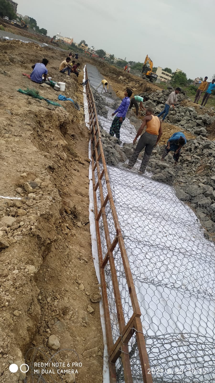 2)Riverbank Protection: Gabions lined with geo are placed along riverbanks to prevent erosion caused by water flow. The geotextile ensures that the soil behind the gabion remains intact, while the gabion itself disperses the energy of the flowing water.